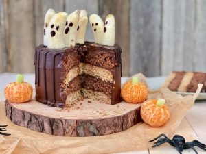 Halloween chocolate cake with marble inside and ghost decorations