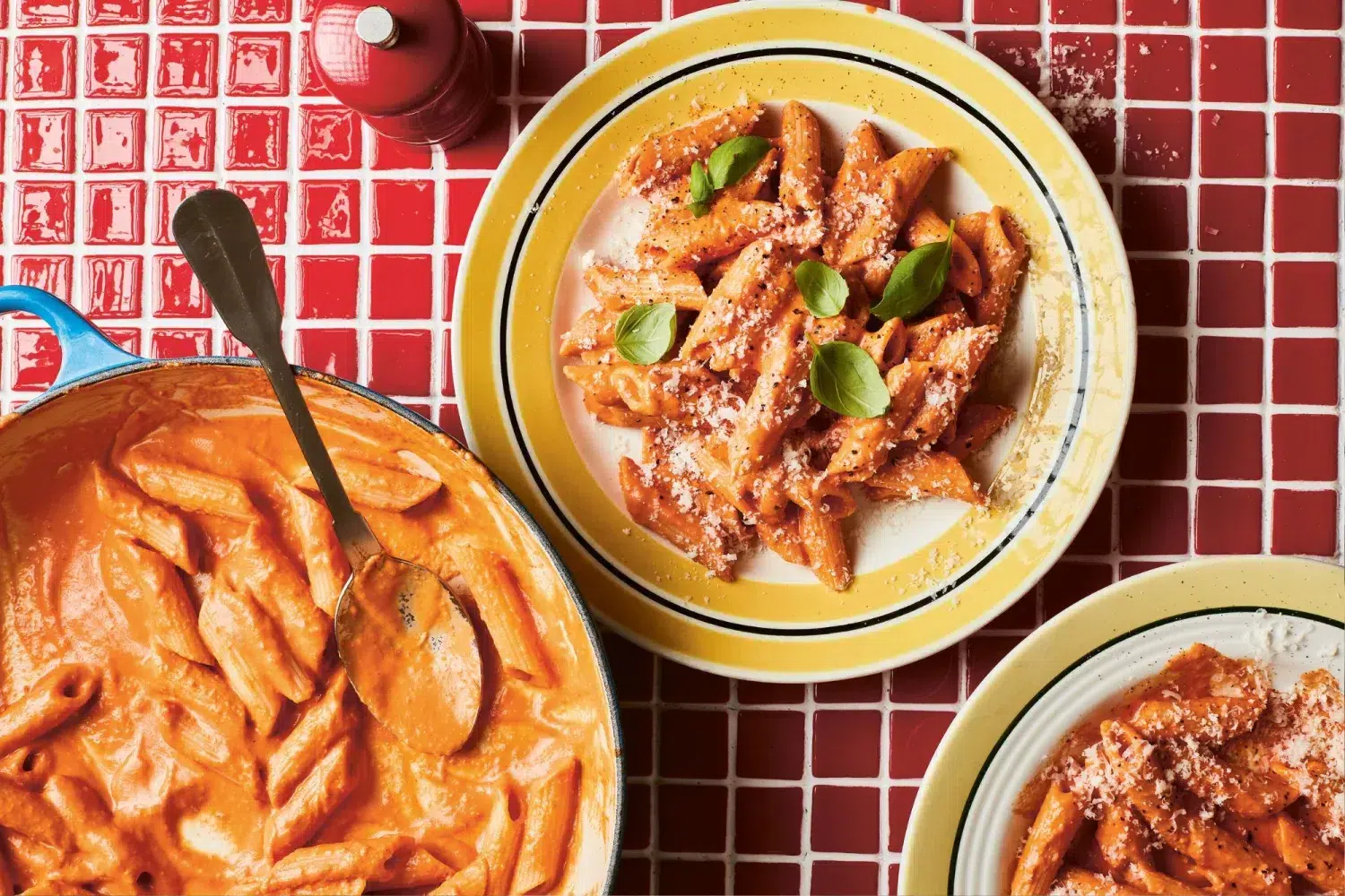- Reheat the tomato sauce, pour in the cream and scatter in the Parmesan. Heat, stirring to melt the cheese, for 1 minute before adding in the cooked pasta, a good seasoning of salt and pepper and some of the reserved pasta water (usually around 1/2 cup) to form a glossy sauce. Stir for 1 minute.